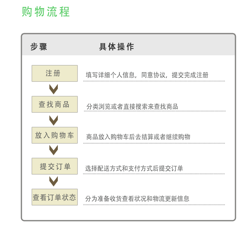 下单操作步骤:1.浏览您要购买的商品,点击“加入购物车”,商品会自动添加到购物车里;2. 如果您需要更改商品数量,需在商品数量框中输入购买数量;3.选好商品后点击“去结算”;4.详细填写收货人信息、支付方式、发票信息,核对送货清单等信息;5.确认无误后点击“提交订单”;6.查看订单详细信息:可进入“我的订单”→“我的订单”查看。